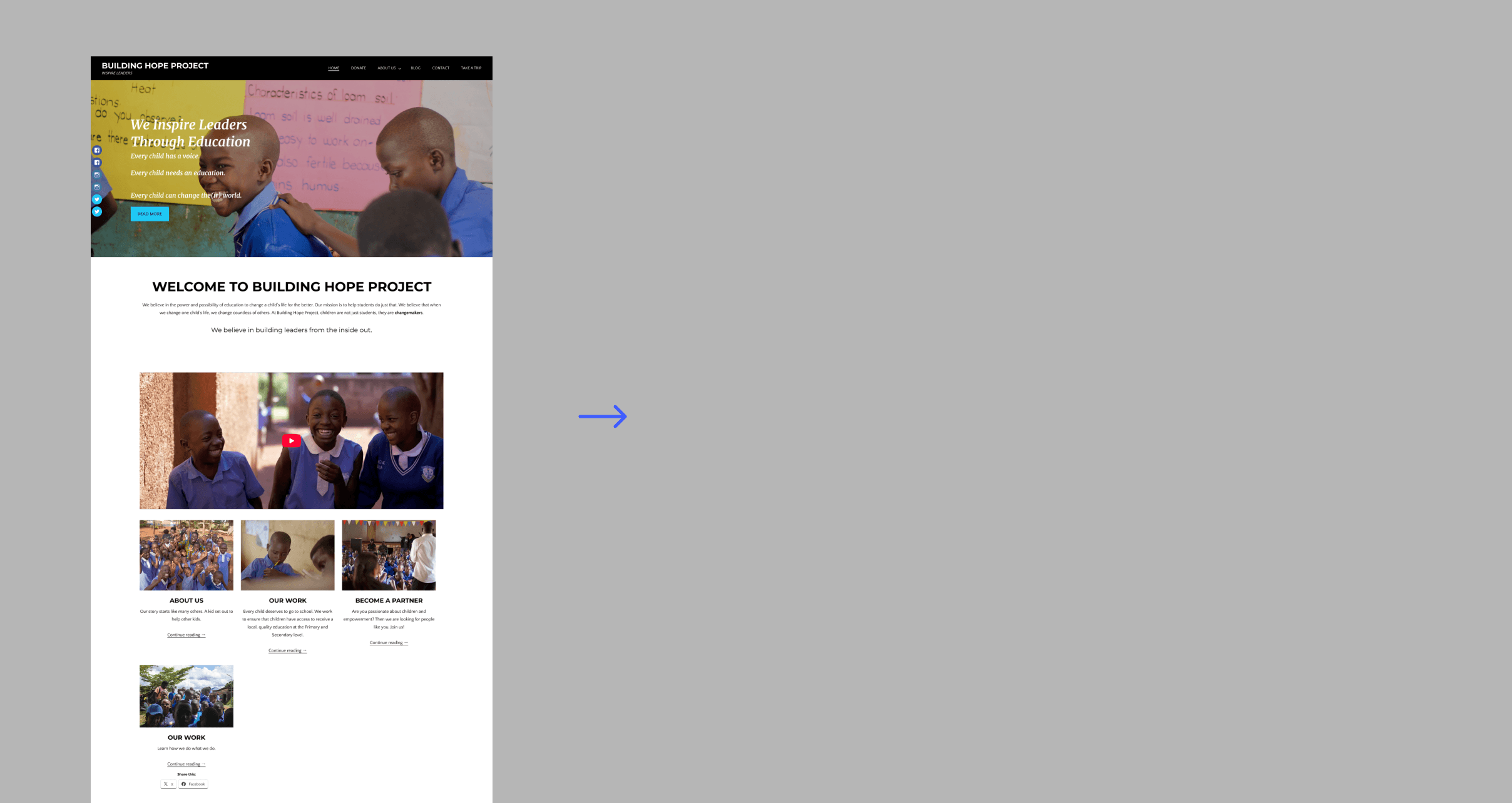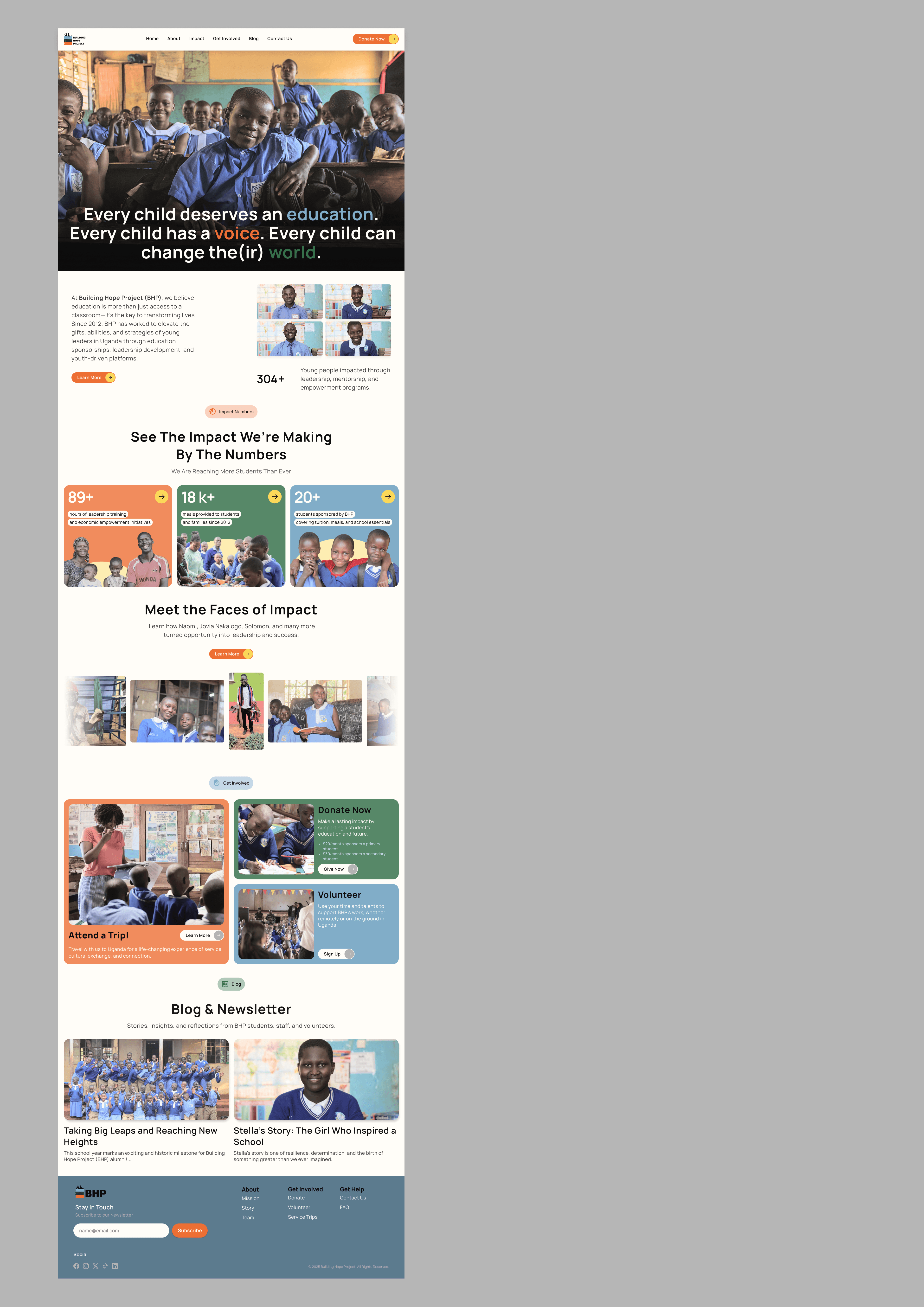 Building Hope Project, a nonprofit empowering youth through education in Uganda, needed a digital presence that matched its mission and impact. The existing site used outdated content and visuals, lacked a clear user journey, and did not guide visitors to take meaningful actions, such as donating or subscribing. As a result, the organization struggled to communicate credibility, connect emotionally with audiences, and grow its supporter base.